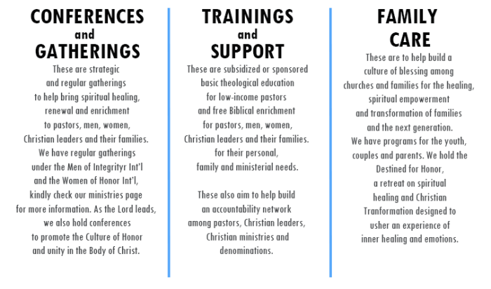 We promote a Christian Culture of Blessing and Honor, and the Biblical Values of Christlike Character, Genuine Unity & Accountability in the Body of Christ.